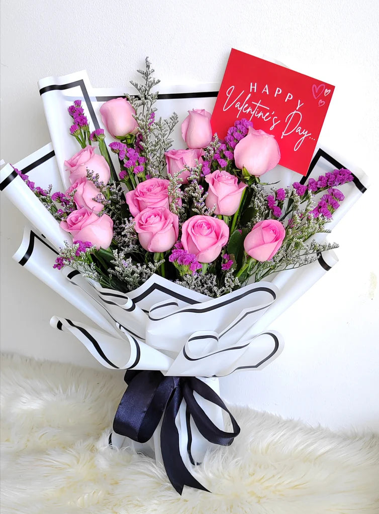 12 stalks fresh pink roses flowers with white baby breath wrapped in black and white wrapping with netting and bow tie ribbon