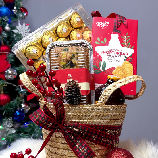 Features a basket including 1 box of Ferrero Rocher chocolates (24pcs), Shortbread, 1 bottle of Bundaberg ginger beer, Homemade fruitcake.