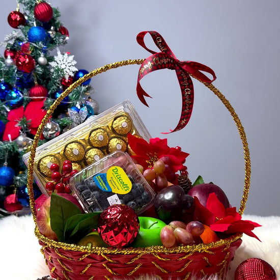 Features a beautiful basket containing fresh mixed fruits, 1 box of blueberries, 1 box of Ferrero Rocher chocolate (24pcs).
