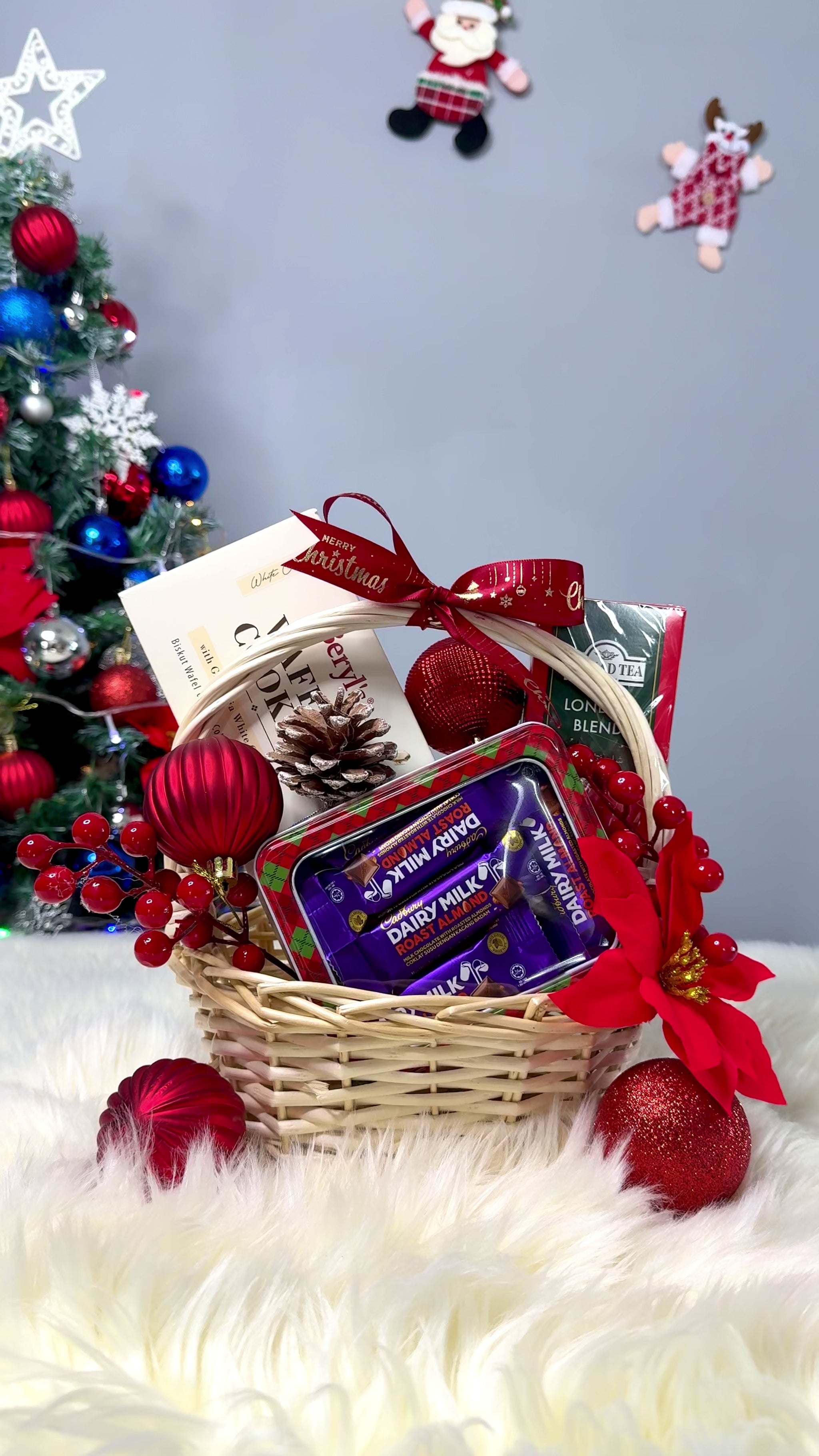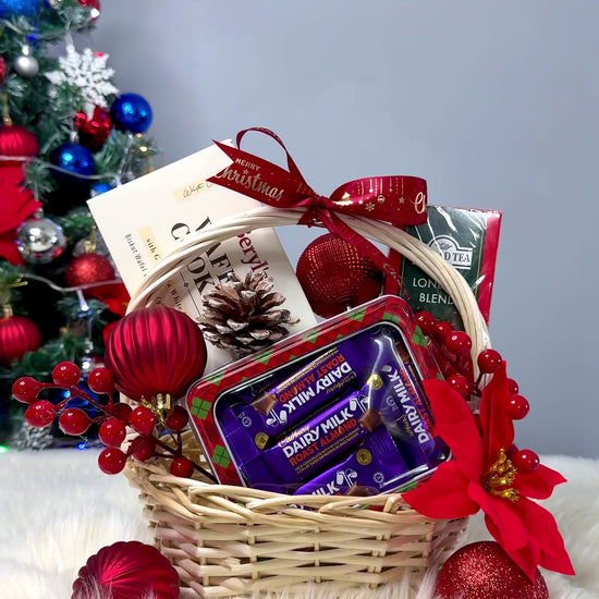 Features a basket including 1 box of Ahmed tea, Beryl's waffle cookies, limited edition Cadbury chocolates in a tin.