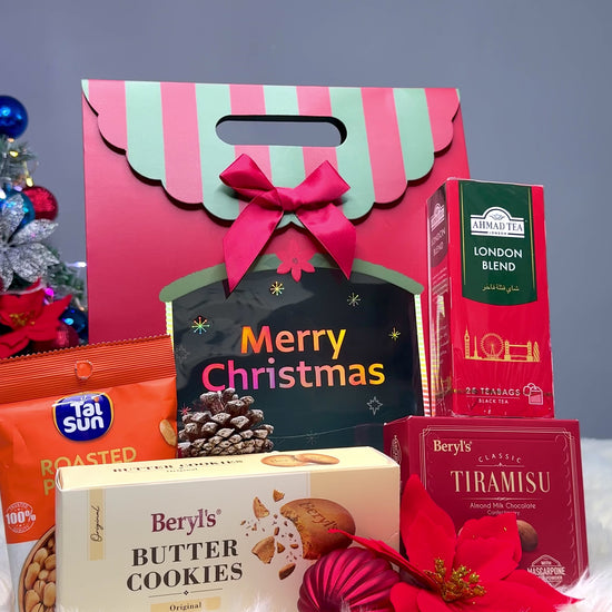 A Merry Christmas paper bag including 1 pack of roasted nut, 1 box of Beryl's butter cookie, 1 box of Ahmed tea, 1 box of Beryl's Almond chocolate.