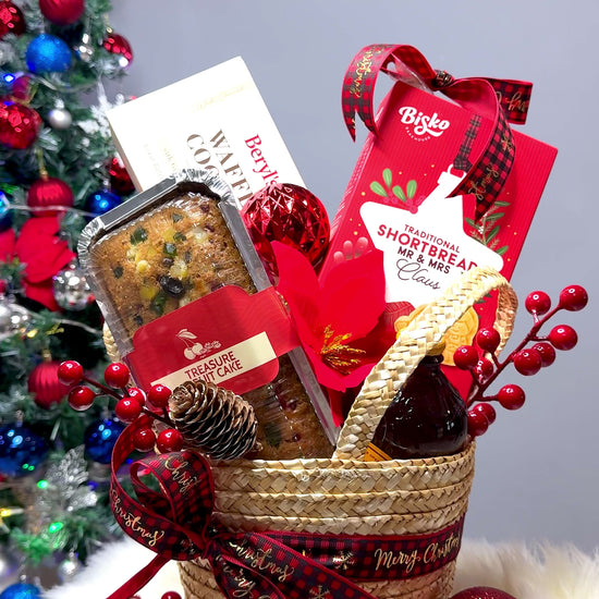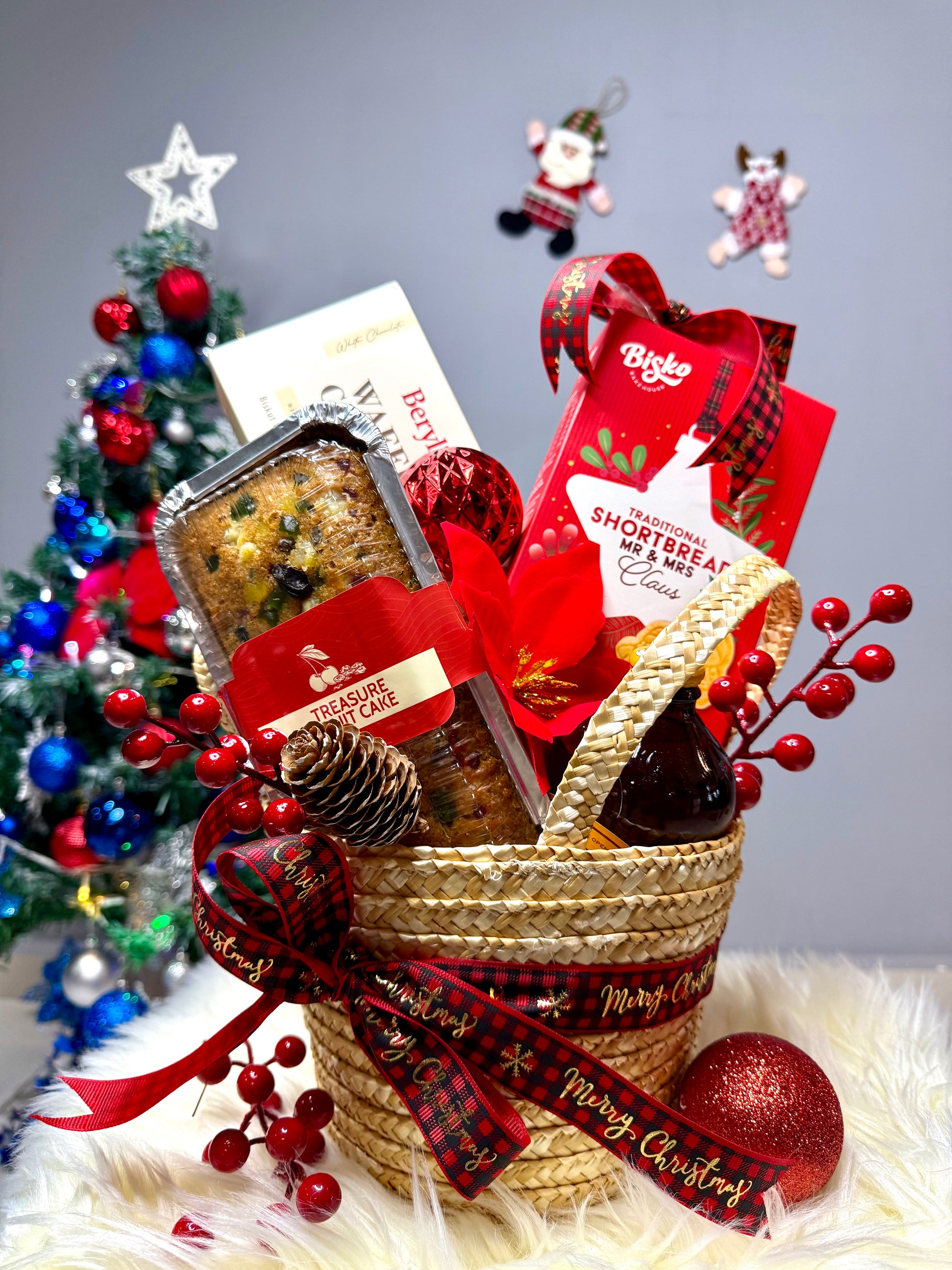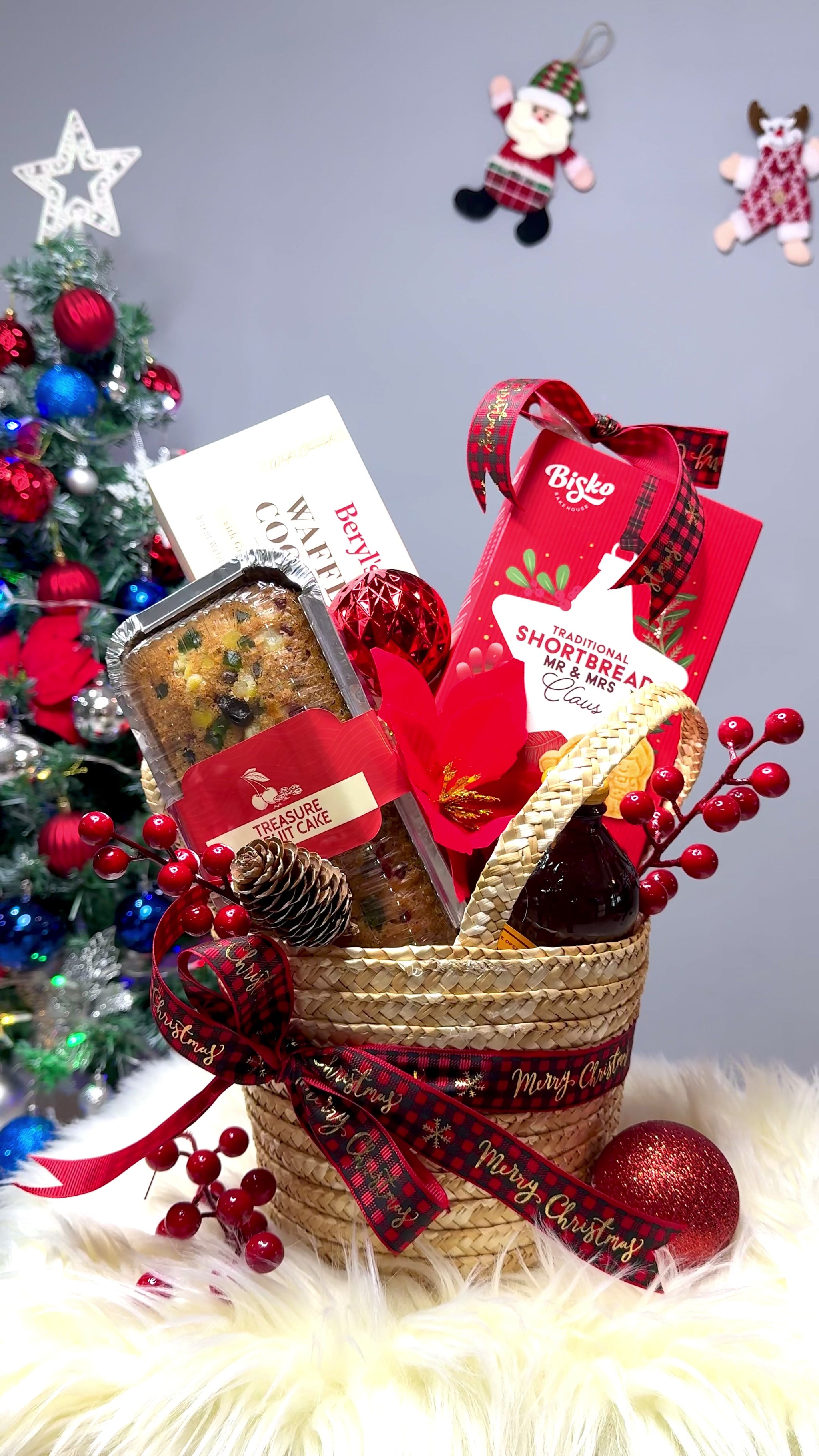 Features a basket containing Beryl's waffle cookie, Shortbread, 1 bottle of Bundaberg, Homemade fruitcake.